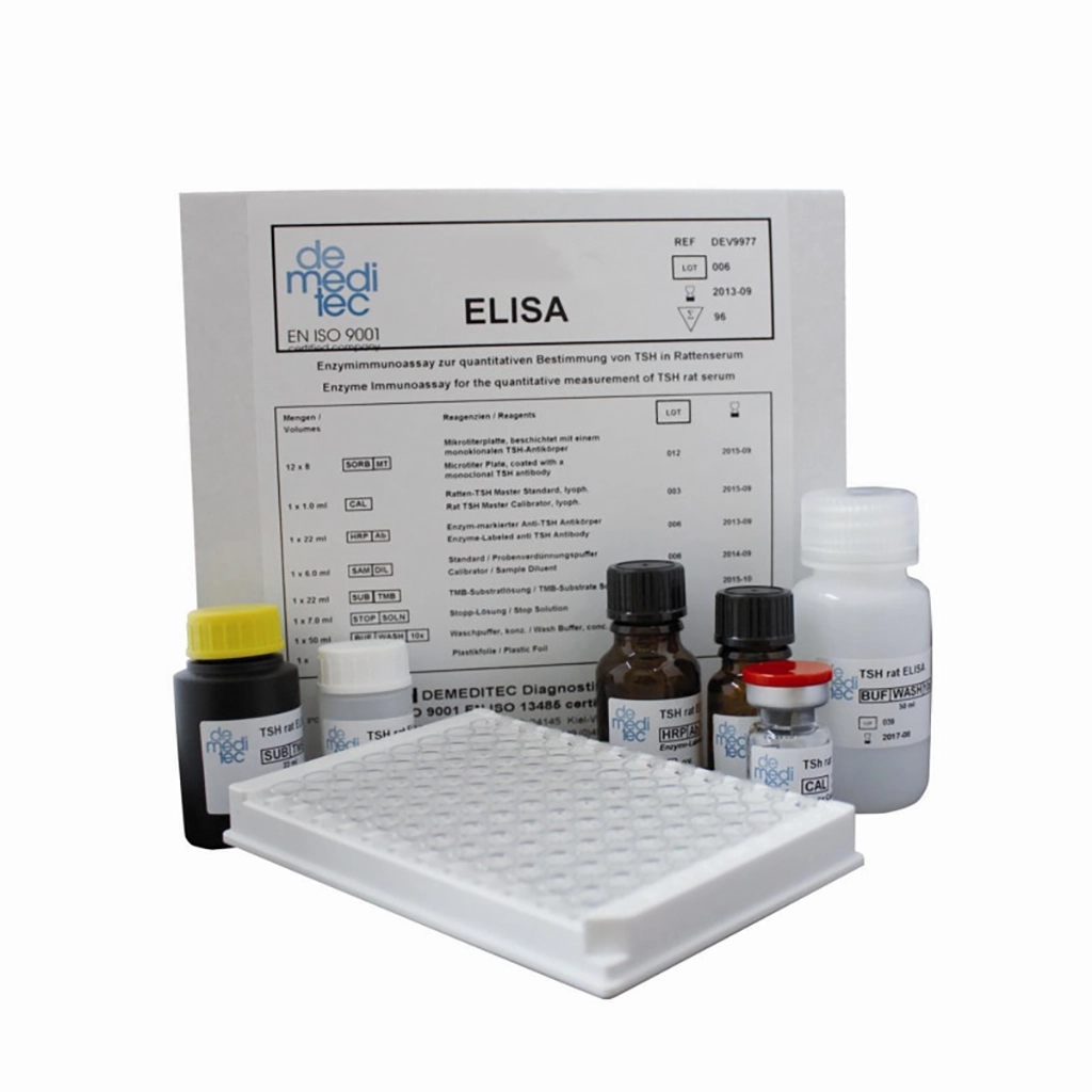 A determinação imunoenzimática qualitativa de antigénios específicos é baseada na técnica ELISA. Microplacas são revestidas com anticorpos específicos para se ligar aos antigénios correspondentes da amostra. Após a lavagem dos poços para remover todo o material não ligado da amostra, um conjugado de anticorpo marcado com HRP é adicionado. Este conjugado se liga aos antigénios capturados. Em uma segunda etapa de lavagem, o conjugado não ligado é removido. O complexo imune formado pelo conjugado ligado é visualizado pela adição de substrato de TMB, que produz um produto de reação azul. A intensidade deste produto é proporcional à quantidade de antigénios específicos na amostra. Ácido sulfúrico é adicionado para interromper a reação. Isso produz uma cor amarela no ponto final. A absorvância a 450/620 nm é lida usando um leitor de microplacas ELISA.